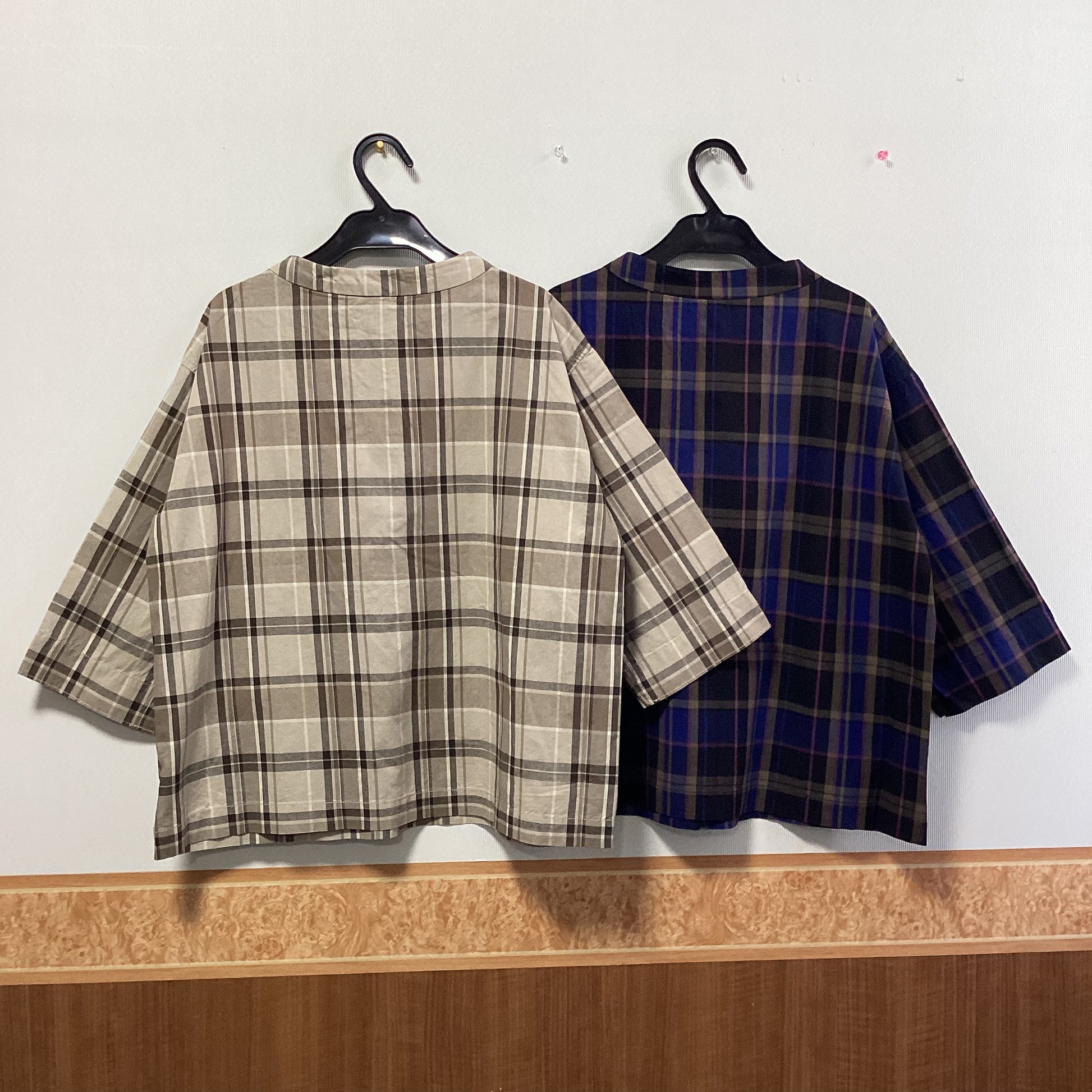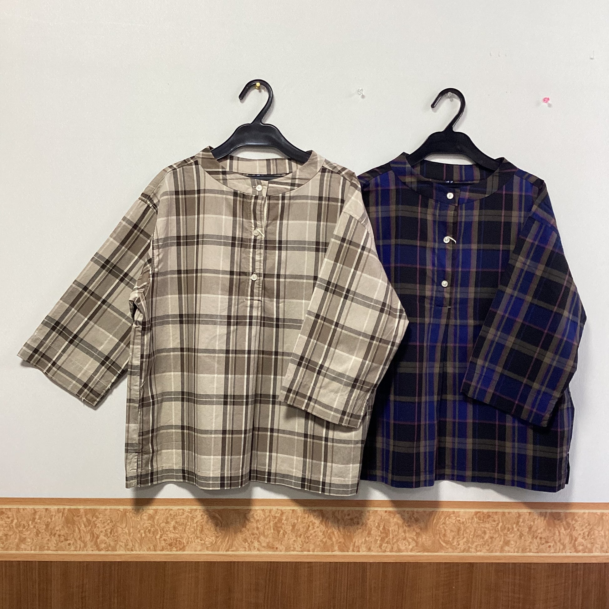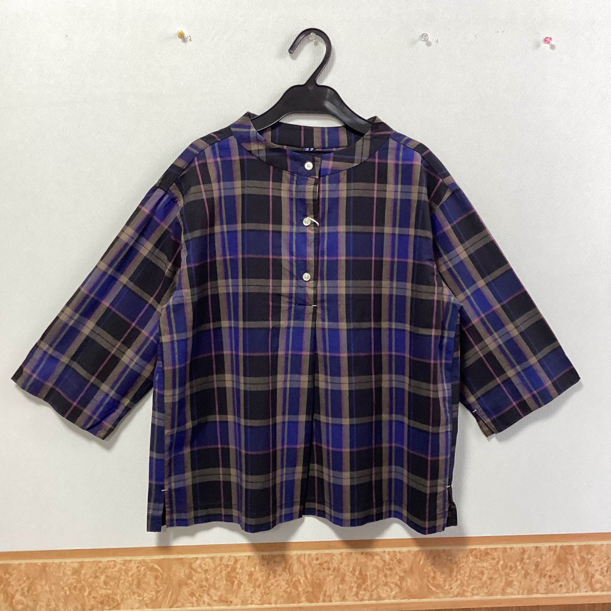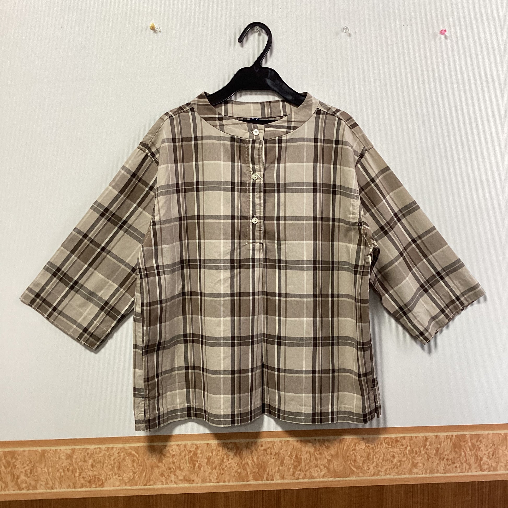 落ち着いた色合いのチェック柄とスタンドカラーの七分袖プルオーバーです。