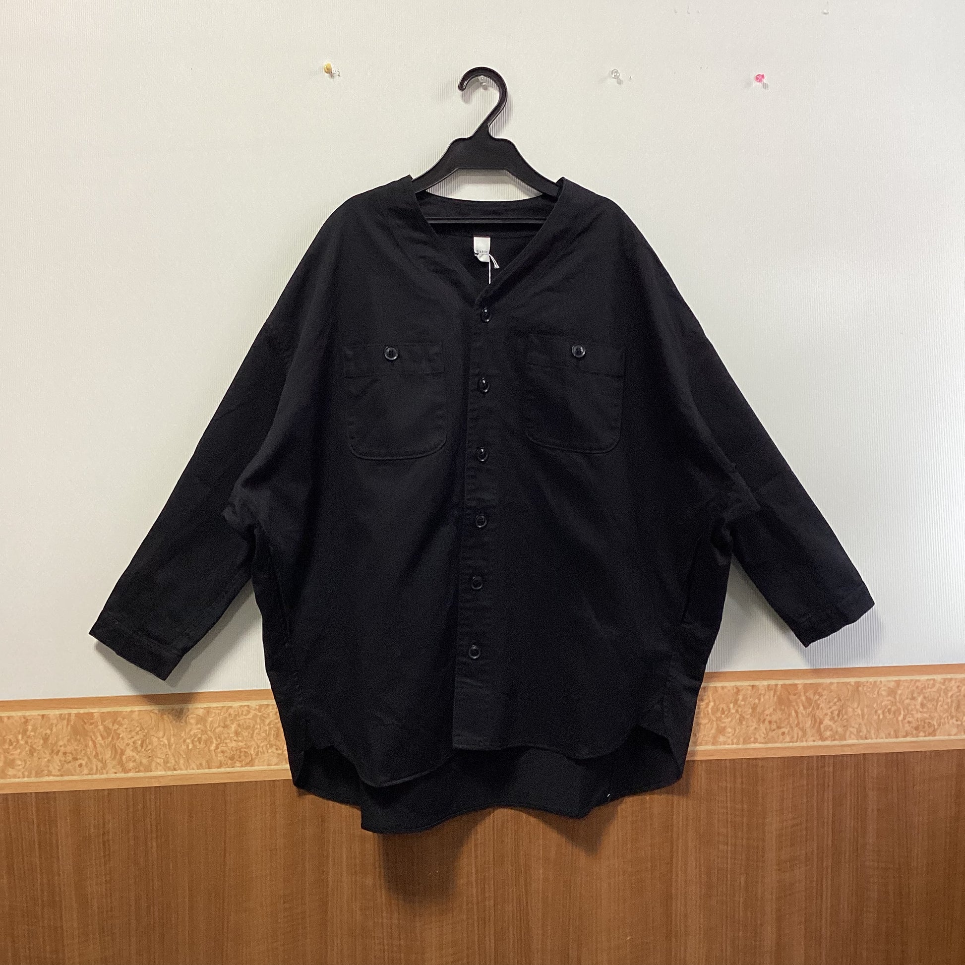 ほどよい厚みとシャリ感のある綿100素材を使用し、左右胸とサイドにはポケットがあります。