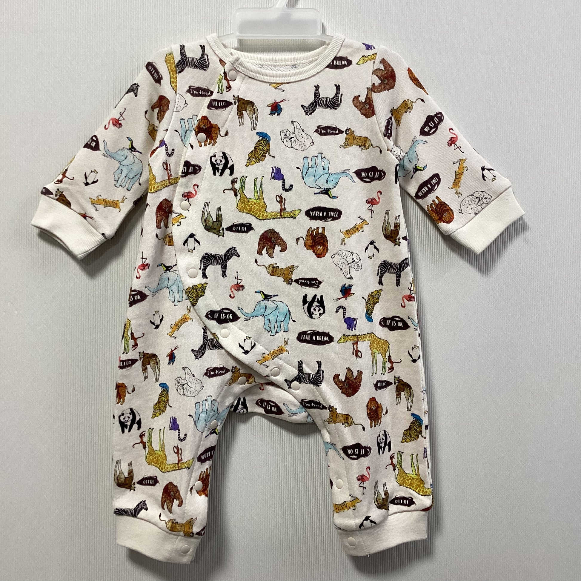 さまざまなアニマルのデザインが入った長袖ロンパースです。