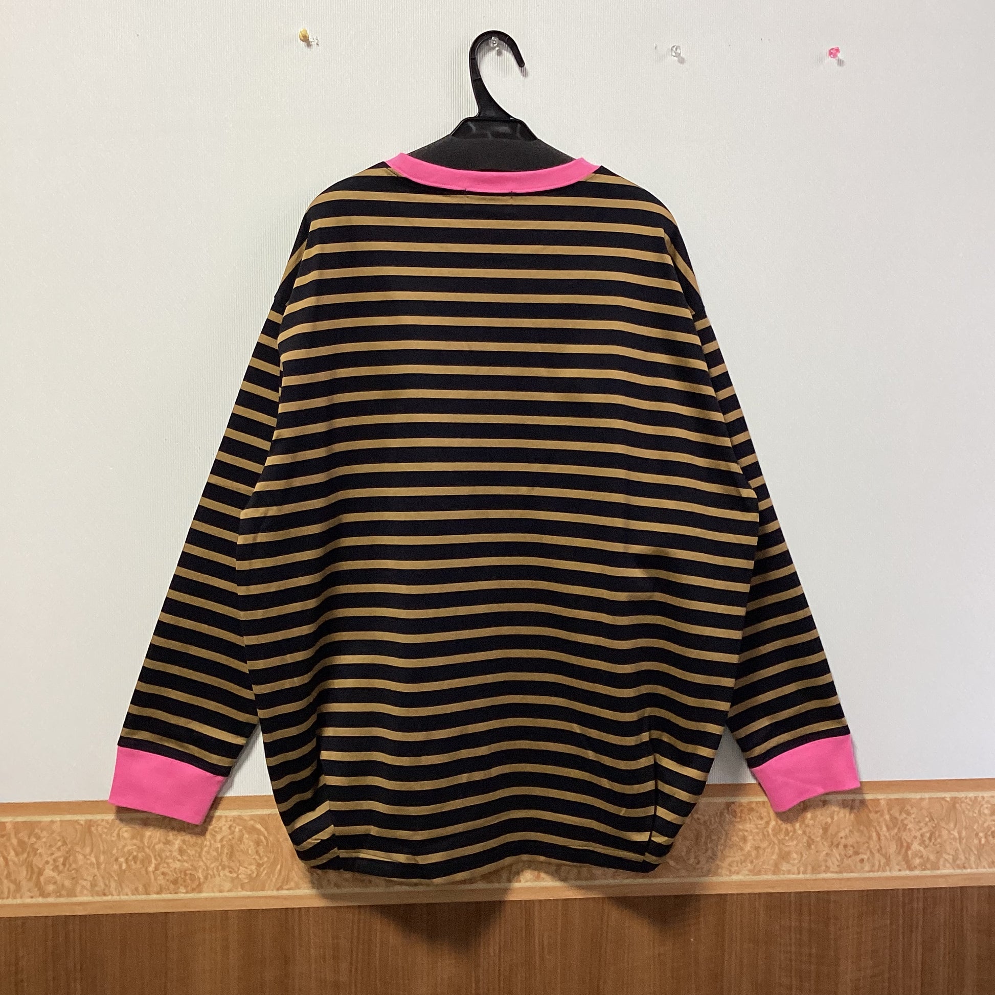 首まわりと袖口のピンクカラーがアクセントのボーダー柄プルオーバーです。