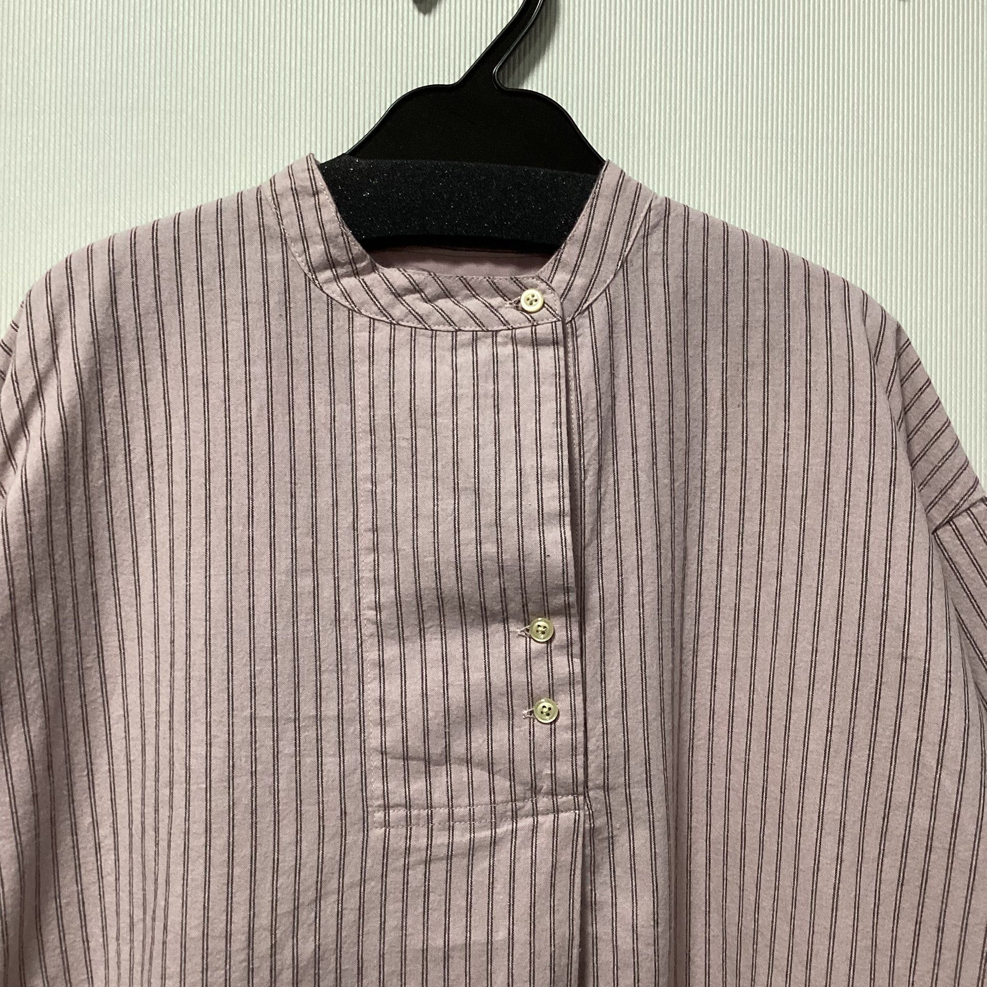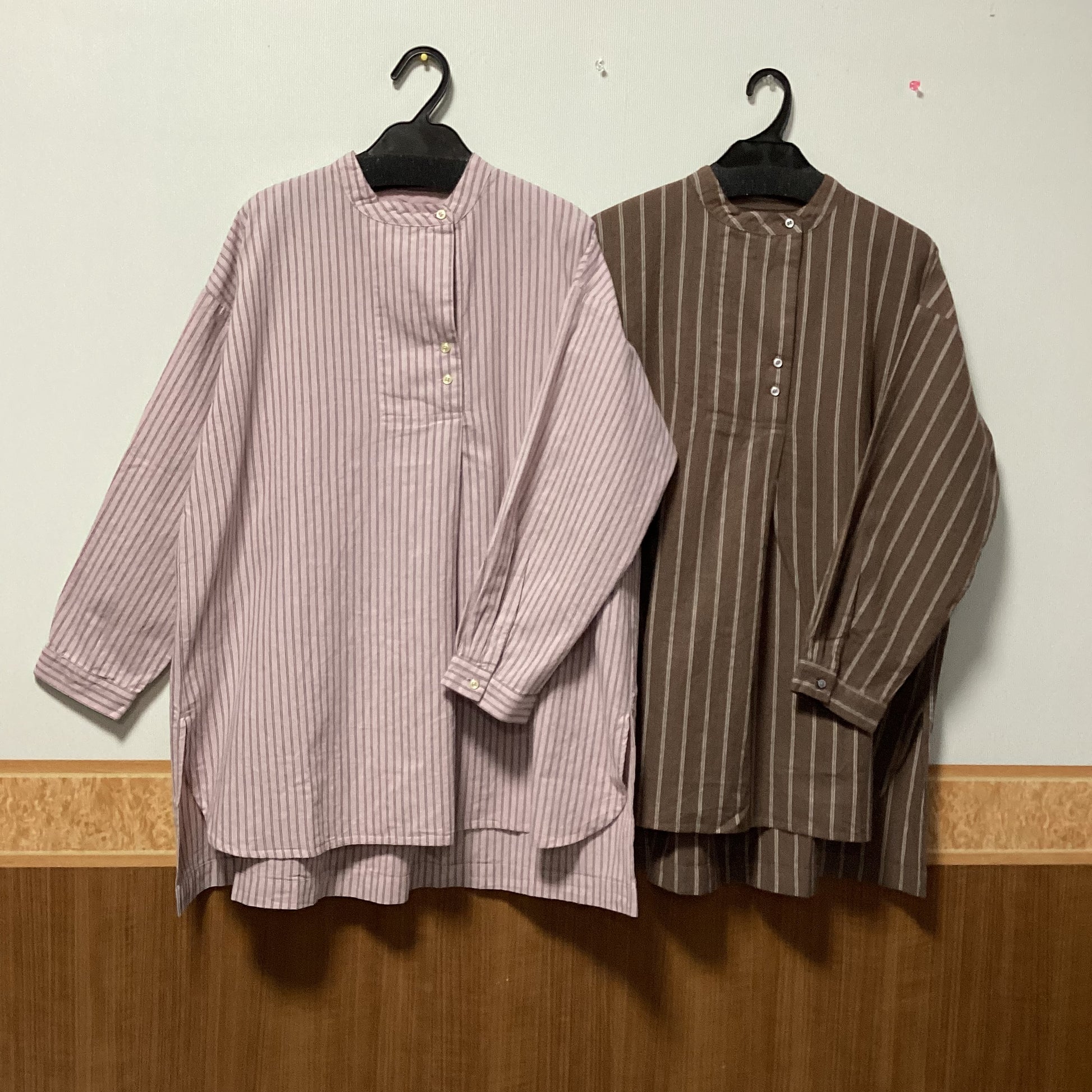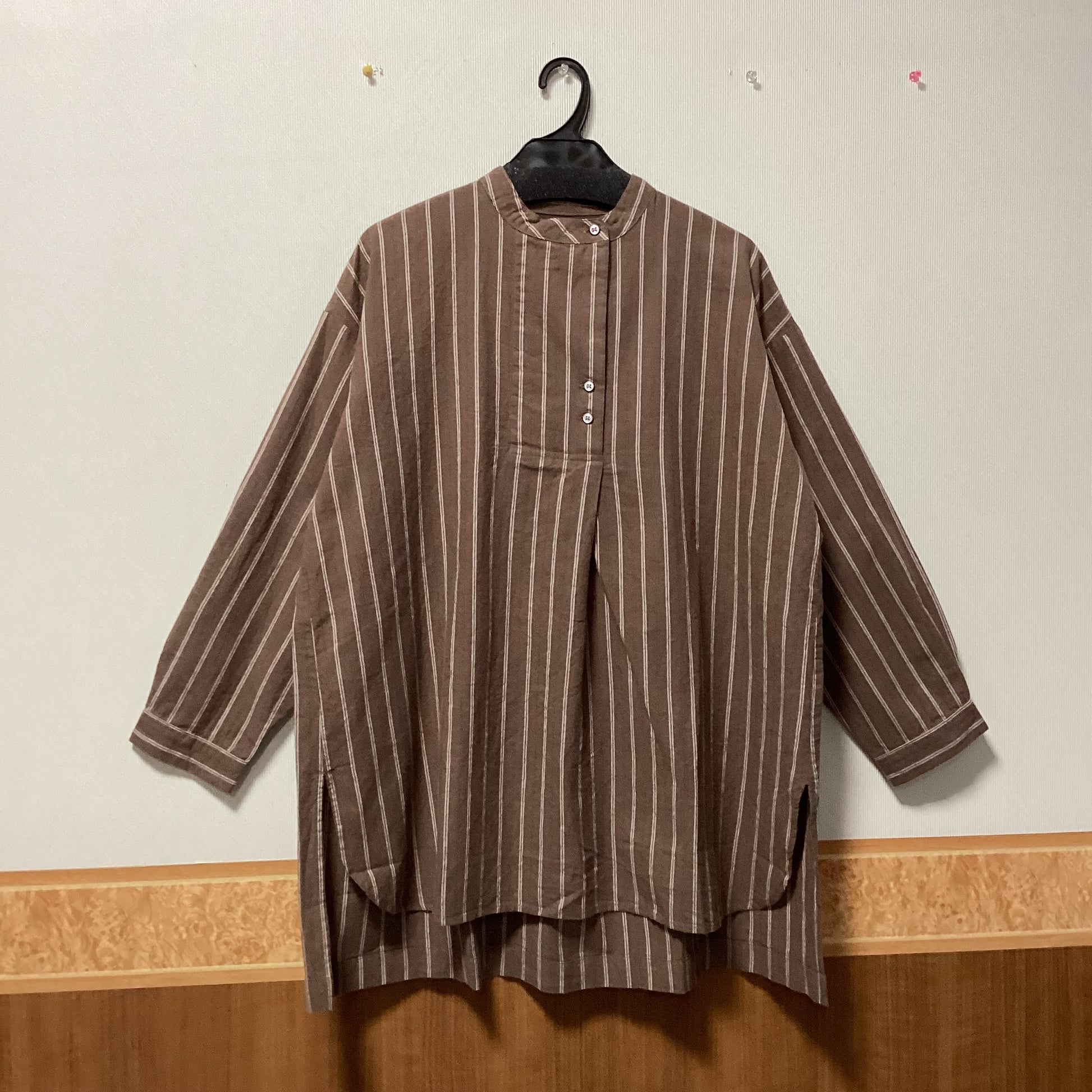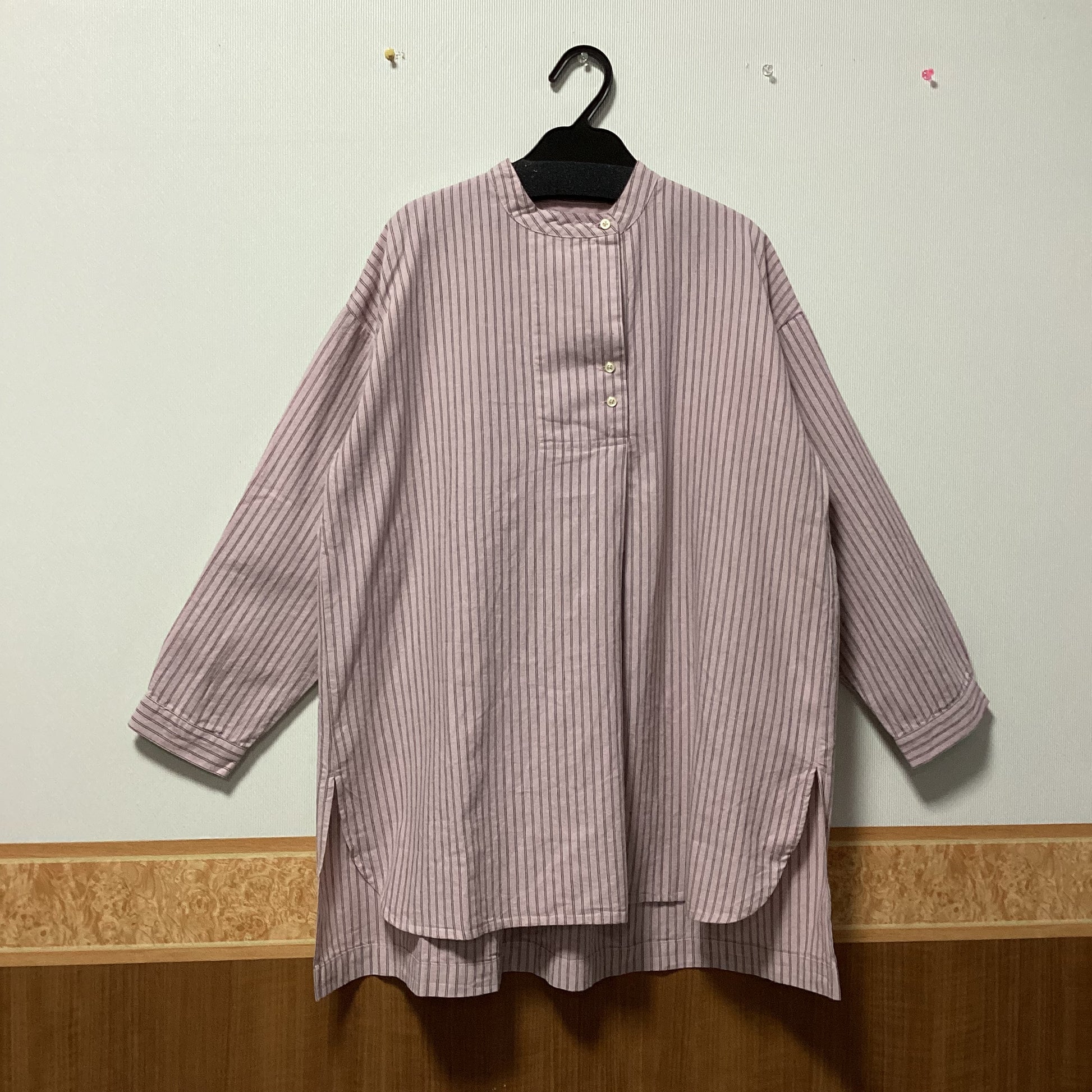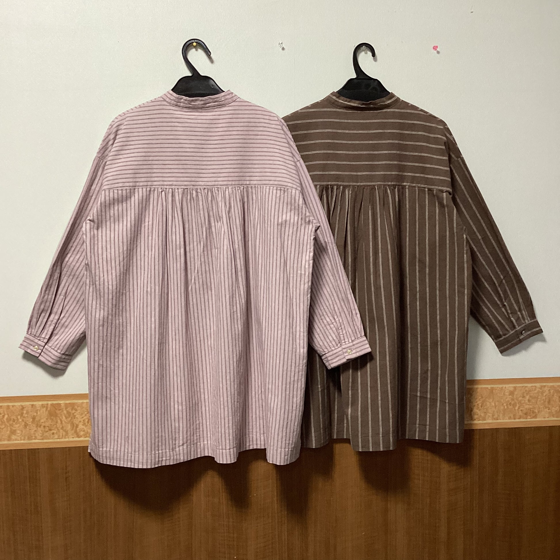 スタンドネックとストライプ柄がポイントのプルオーバーチュニックシャツです。