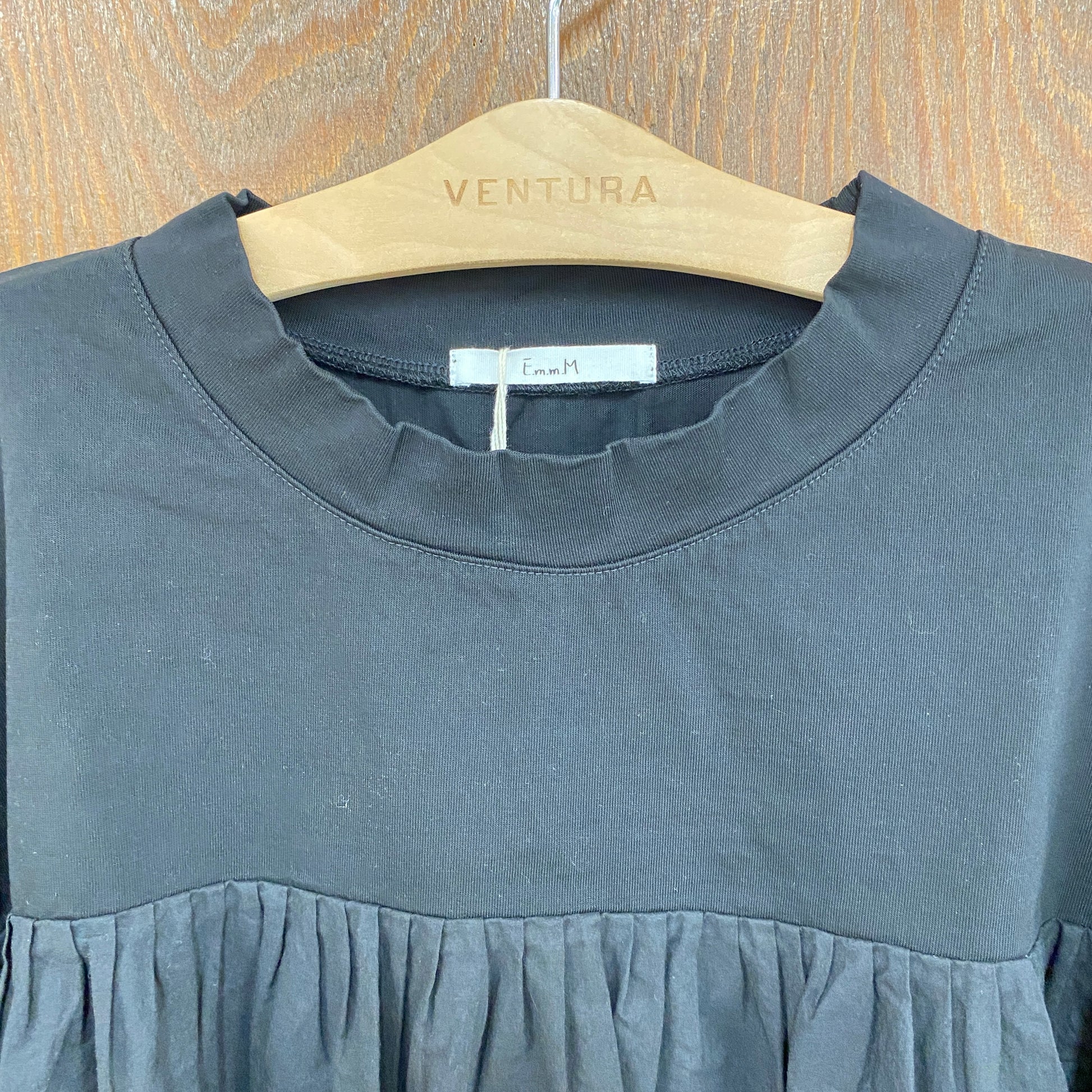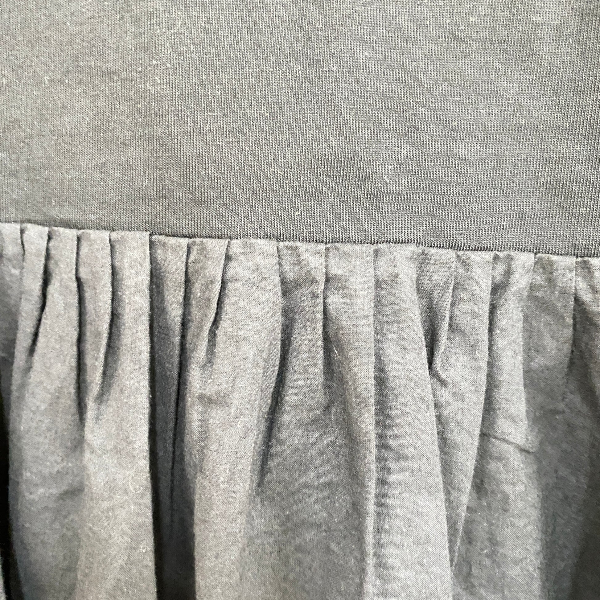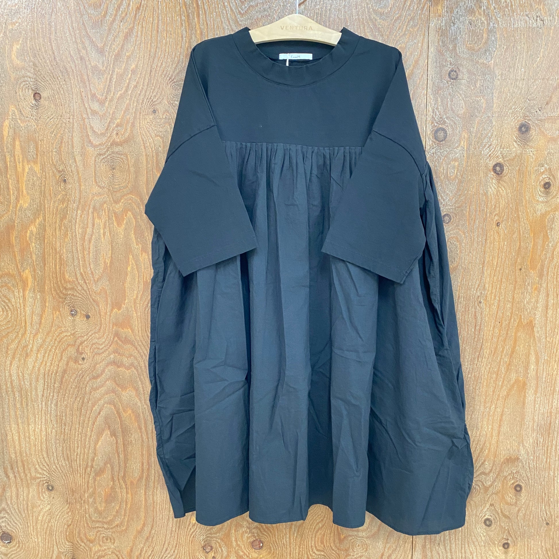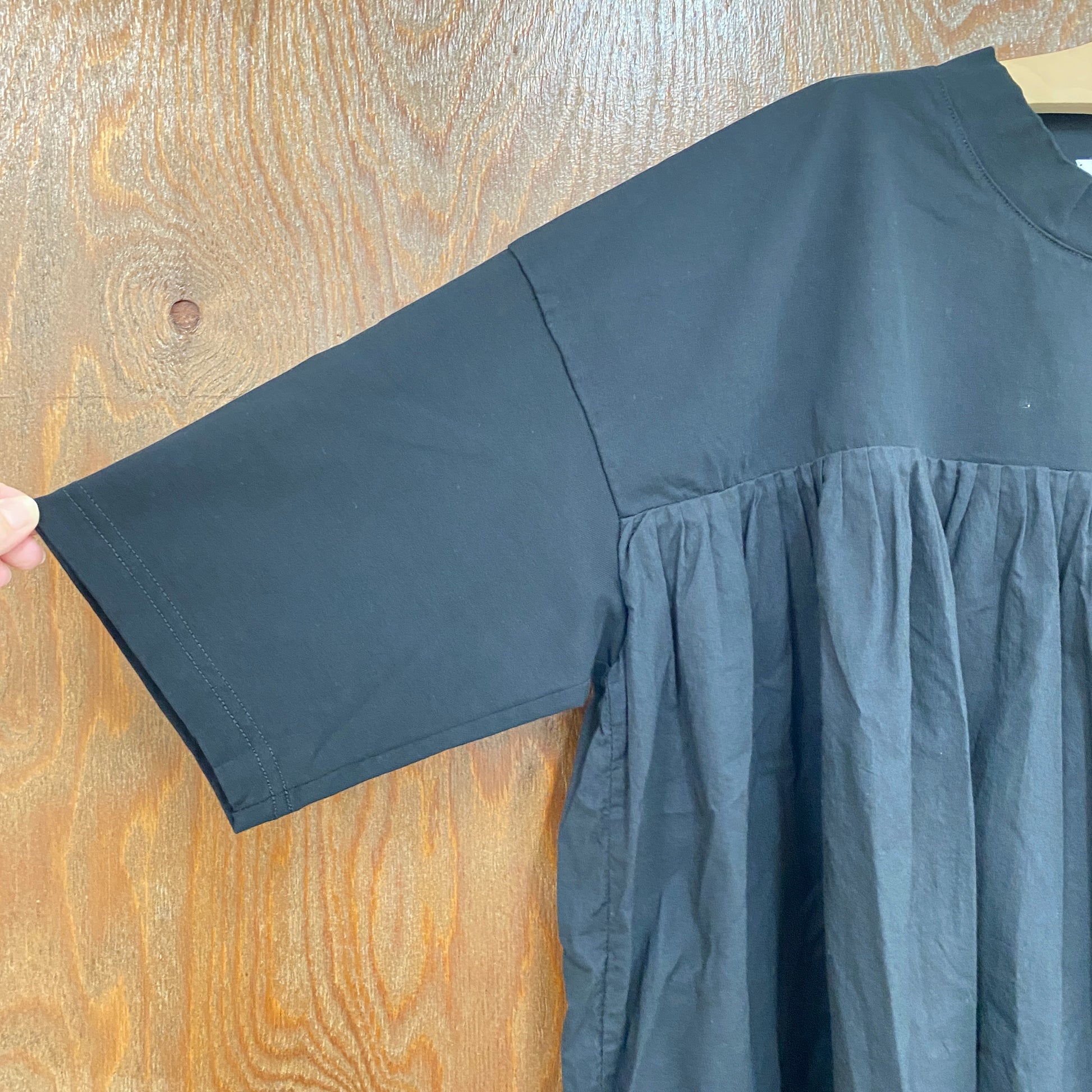 胸元でシャツ素材に切り替わったチュニック。ふわっとしたシルエットがかわいらしいです。気になる二の腕をカバーしてくれる袖丈も嬉しいポイント!