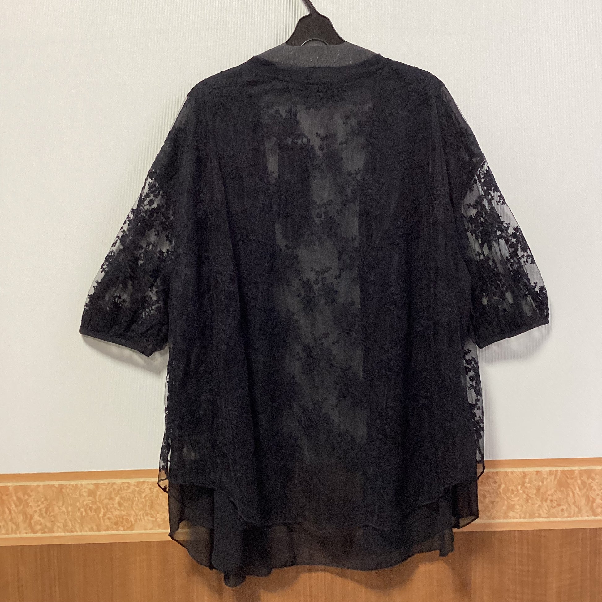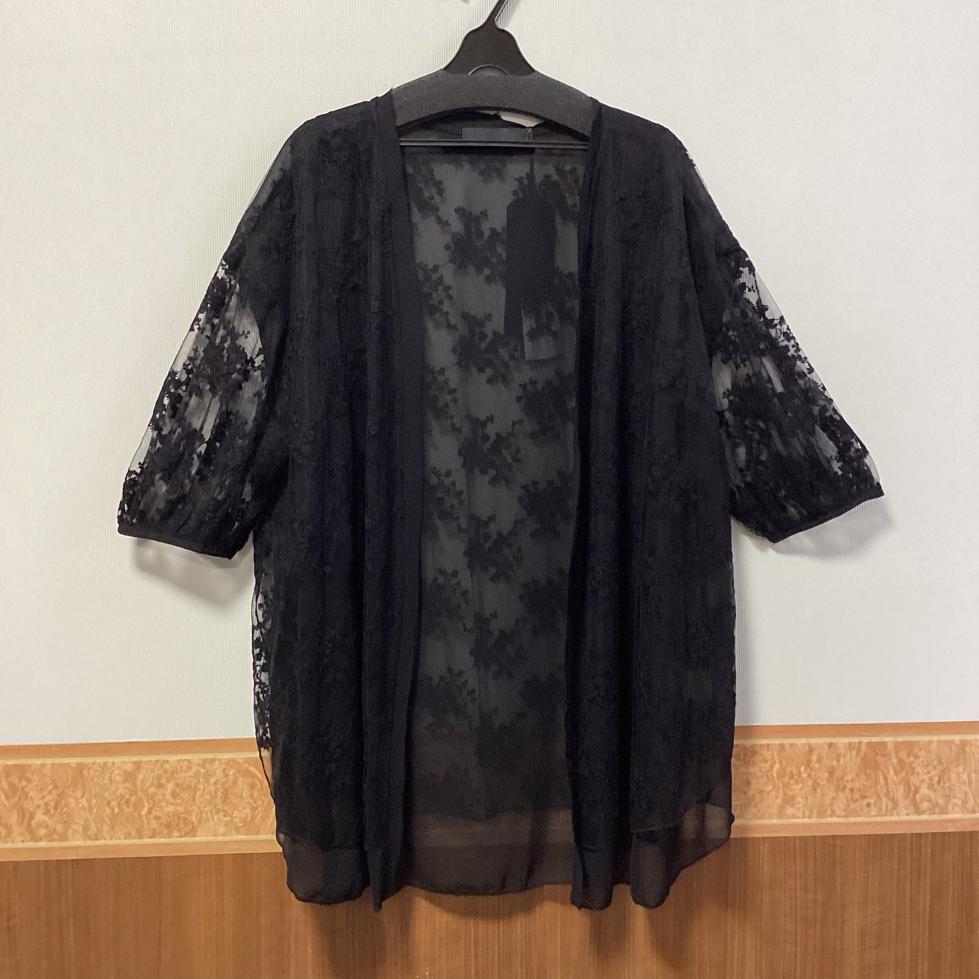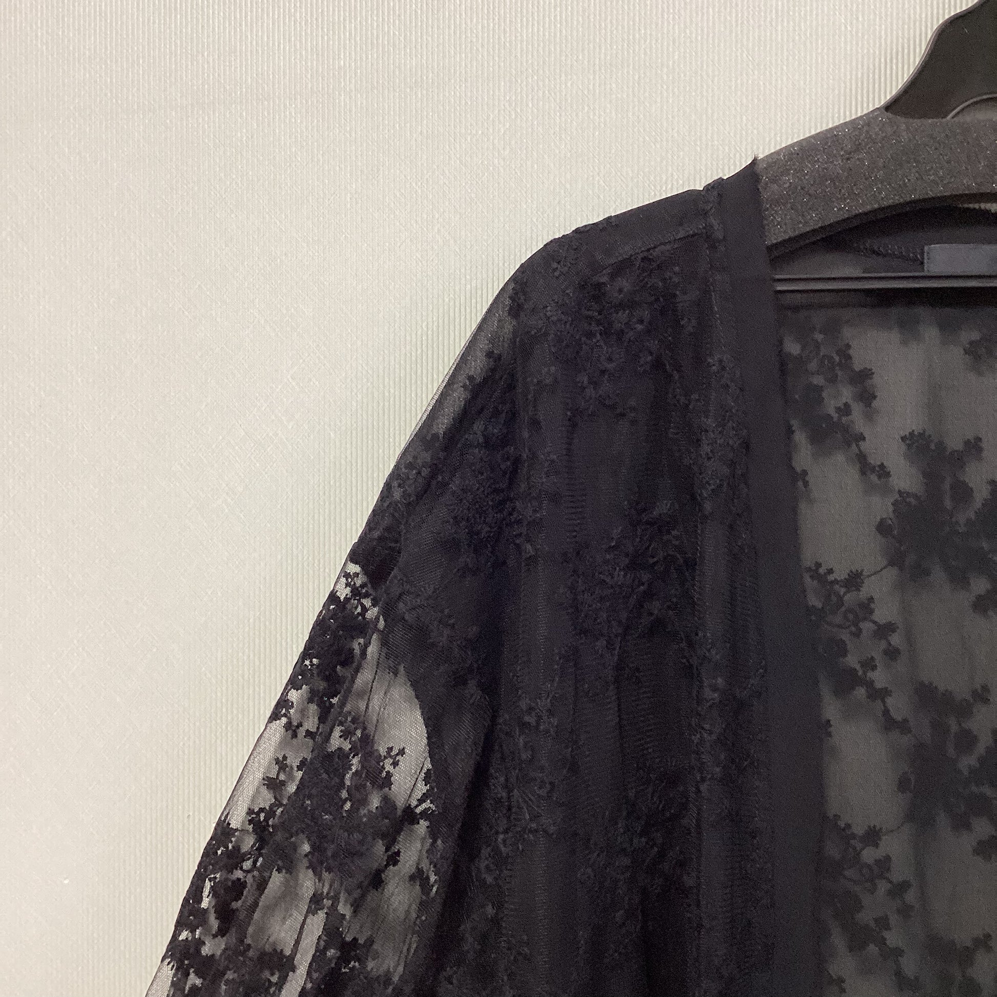 透け感がありエレガントな刺繍入りのシアー素材で、身頃はレイヤード仕立てのラップカーディガンです。